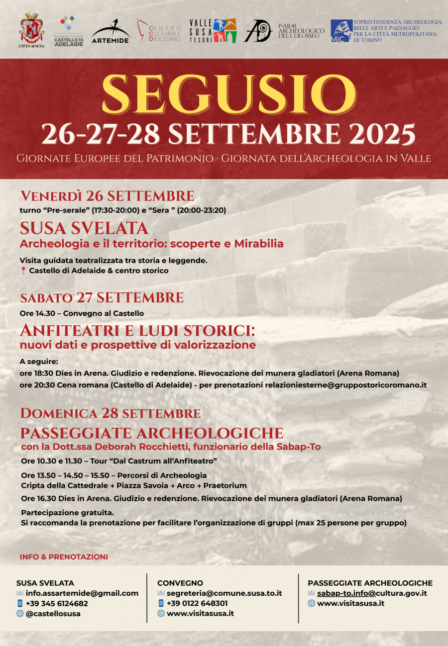 Le giornate Europee del patrimonio, coincidenti con la Giornata dell’archeologia in valle prevedono quest’anno un ricco palinsesto di eventi: si comincia venerdì nel tardo pomeriggio e poi la sera con le visite guidate e teatralizzate a partire dal Castello di Adelaide e attraverso luogo poco noti del centro storico alla scoperta di testimonianze archeologiche della Segusio romana. Per l’occasione verranno svelati al pubblico in anteprima mirabili reperti dagli ultimi cantieri di scavo. Si prevedono due turni: il primo dalle ore 17.30 alle 20.00 il secondo dalle 20.00 alle 23.00.